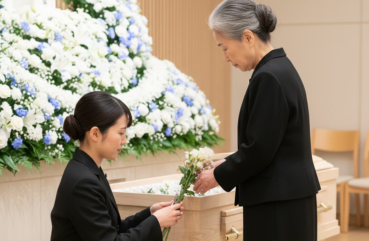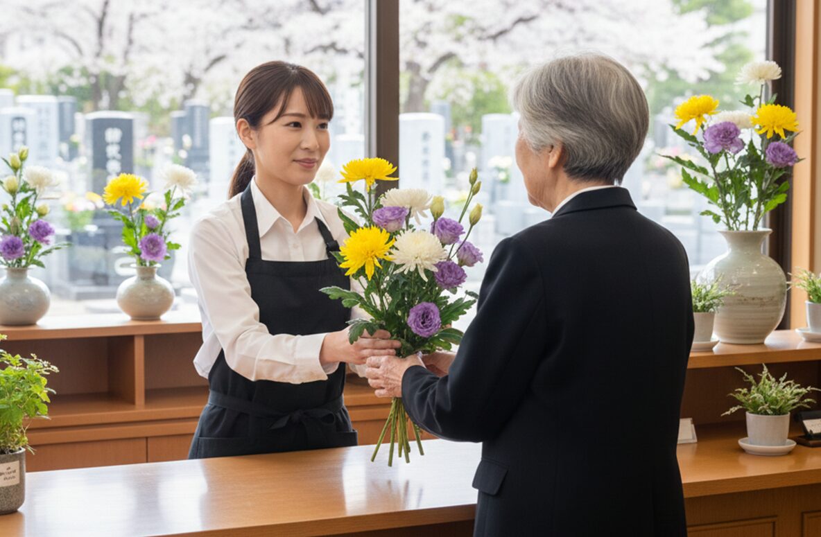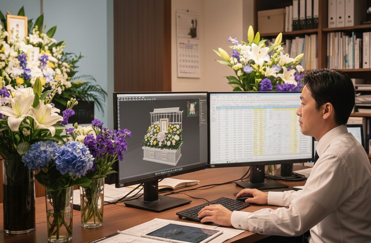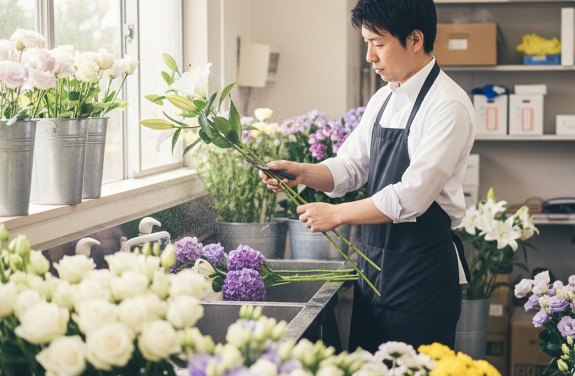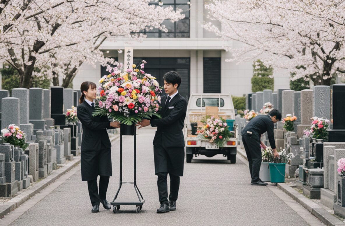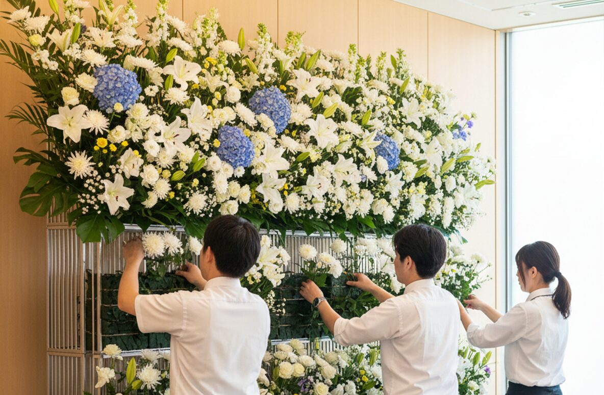FLOWER 生花部 生花部の仕事(一日の流れ) 葬儀における「生花祭壇」の制作を中心に、花に関わる多角的な業務をお任せします。 2〜3名のチーム制で作業を行うため、未経験の方でも補助から安心してスタートできる環境です。 花材の準備・水揚げ 仕入れた花材の状態を確認し、水を吸わせる作業(水揚げ)。祭壇に使用する花を揃えます。 最高の状態で送り出すためのケア。一輪一輪の個性を引き出す下準備を大切にしています。 生花祭壇の制作(チーム作業) 2〜3名で協力し、ベース作りから花の差し込みまでを行います。定型デザインや、ご要望に応じたオリジナル祭壇を仕上げます。 想いを束ね、チームで命を吹き込む。ご遺族の心に寄り添う唯一無二の景色を創り上げます。 店舗業務・仏花制作 併設霊園のお参り用仏花の制作や、ショップでの接客・小売り対応。 日常の祈りに、彩りと安らぎを。お参りの方の想いを汲み取り、親身な言葉とお花で迎えます。 設営・配送・回収 完成した供花や祭壇パーツを式場へ配送・設営。また、終了した式の花を回収し、片付けを行います。 静謐な空間を整える最後の仕上げ。迅速かつ丁寧な振る舞いで、厳かな式の土台を支えます。 故人様へのお供え(切花作業) 葬儀後、祭壇からお花を切り出し、ご遺族が故人様に添えられるように整えます。※故人様と対面する大切な時間です。 手から手へ、感謝を届ける橋渡し。最期の対面を美しく飾るため、真心を込めて花を整えます。 翌日の準備・事務 花材の発注、在庫の管理、祭壇デザインの打ち合わせやプランニング。 明日の感動を支える確かな土台作り。細やかな管理と創意工夫が、次なる安心へと繋がります。 ABOUT WORKS 仕事を知る FUNERAL 葬祭部 READ MORE FLOWER 生花部 READ MORE VEHICLE 車輌部 READ MORE